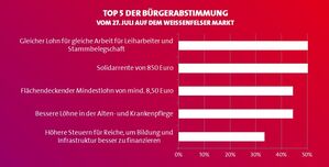 Unmittelbar daran knüpft die Bürger-Abstimmung an: Alle sind aufgerufen, aus insgesamt 26 Forderungen unseres Wahlprogramms die fünf wichtigsten Projekte auszuwählen. Diese fünf meist gewählten Forderungen wollen wir als SPD sofort nach der Bundestagswahl umsetzen. Die Bandbreite der Themen reicht dabei von A wie Altersversorgung bis hin zu Z wie Zukunftsinvestitionen in Bildung.